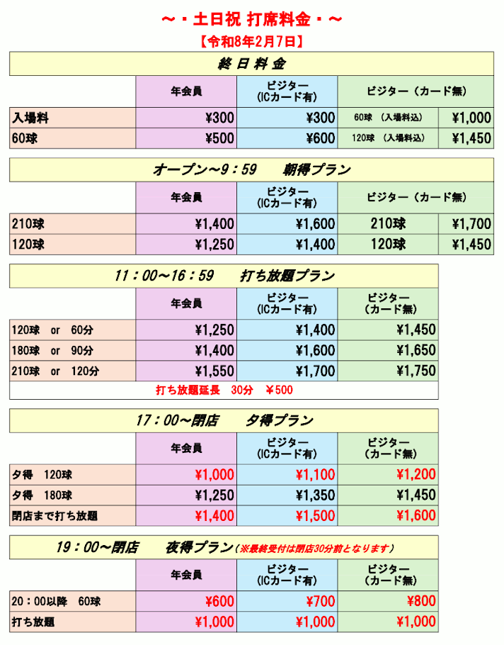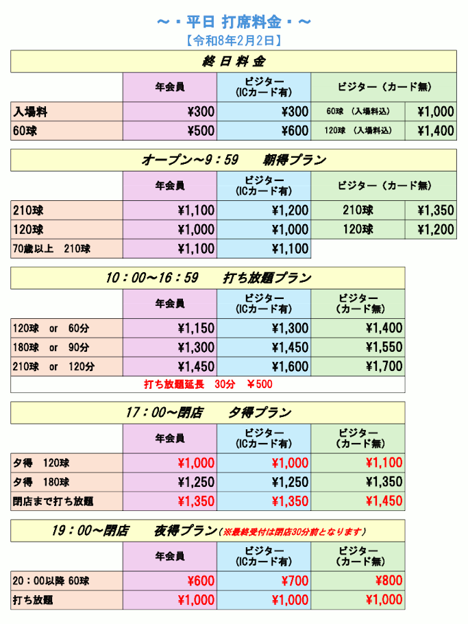 3.打席料金一部改定のご案内